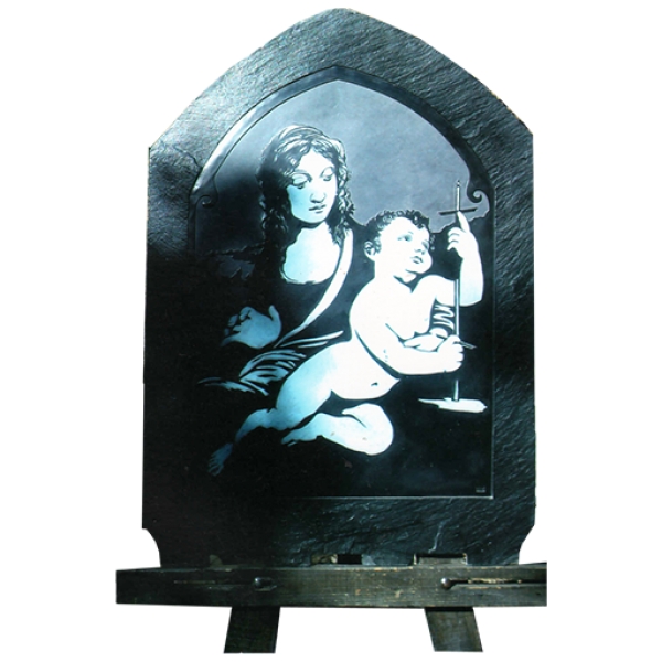Ardósia esculpida em baixo relevo.