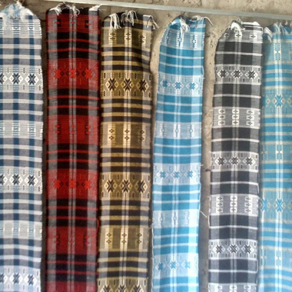 - Outras informações: Algodão branco e algodão tingido com banho de índigo, tecido em tear de liço em 6 bandas de cerca de 17cm cada unidas pelos bordos. Dimensão padrão: 1,95 x 1,0cm .